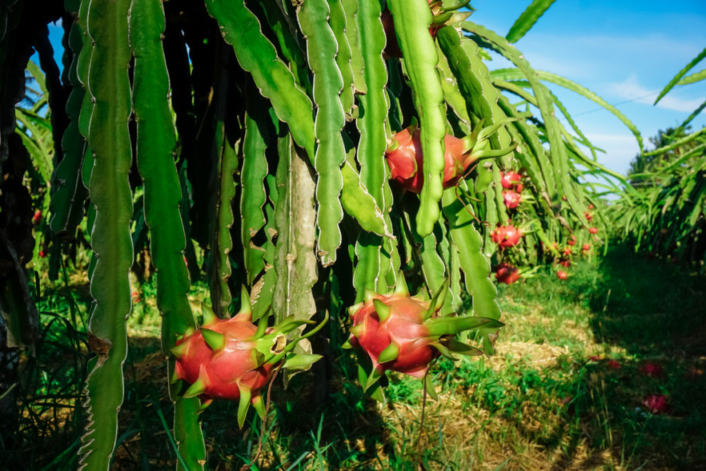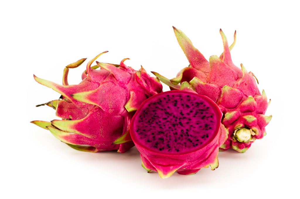 ドラゴンフルーツは、熱帯雨林原産でサボテン科の果実。スペイン語では pitahaya と表記するため、日本ではピタヤともいわれます。果皮は赤くツヤがあり、サボテン科果実特有の鱗のような突起をいくつか持ち、果肉は濃赤色のサクサクとしたゼリー状で、ゴマをまぶしたように黒い種が入っています、
