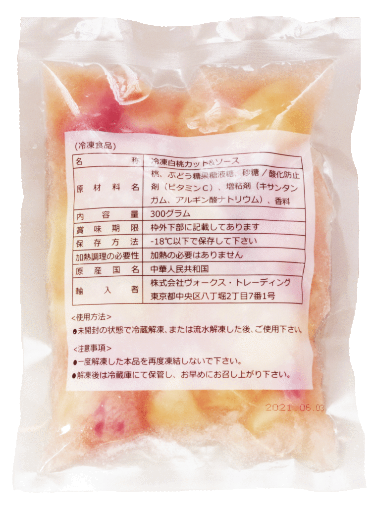 | 商品名 | : | 冷凍白桃カット&ソース |