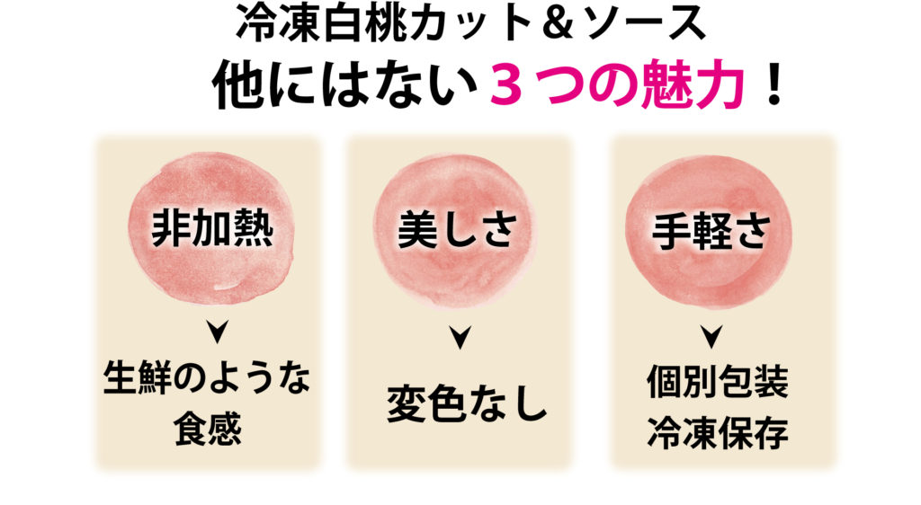 白桃カット&ソースは、「果実の生食感」と「冷凍ソースの便利さ」を追求した新商品です