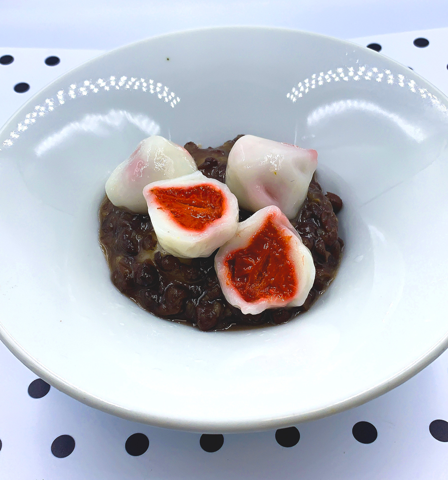 3.あんこをお好みの固さにし、冷えたストロベリー白玉にトッピングする