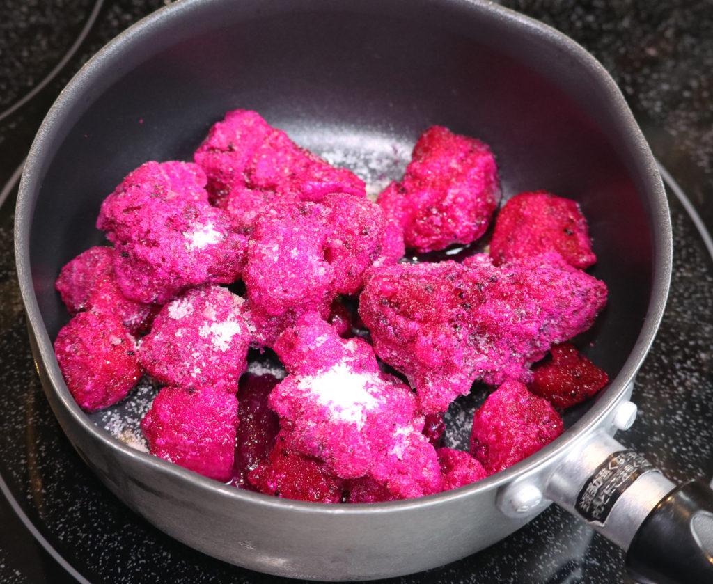 1.冷凍ドラゴンフルーツと砂糖、レモン汁、塩を鍋に入れて、20分ほど放置して、馴染ませる