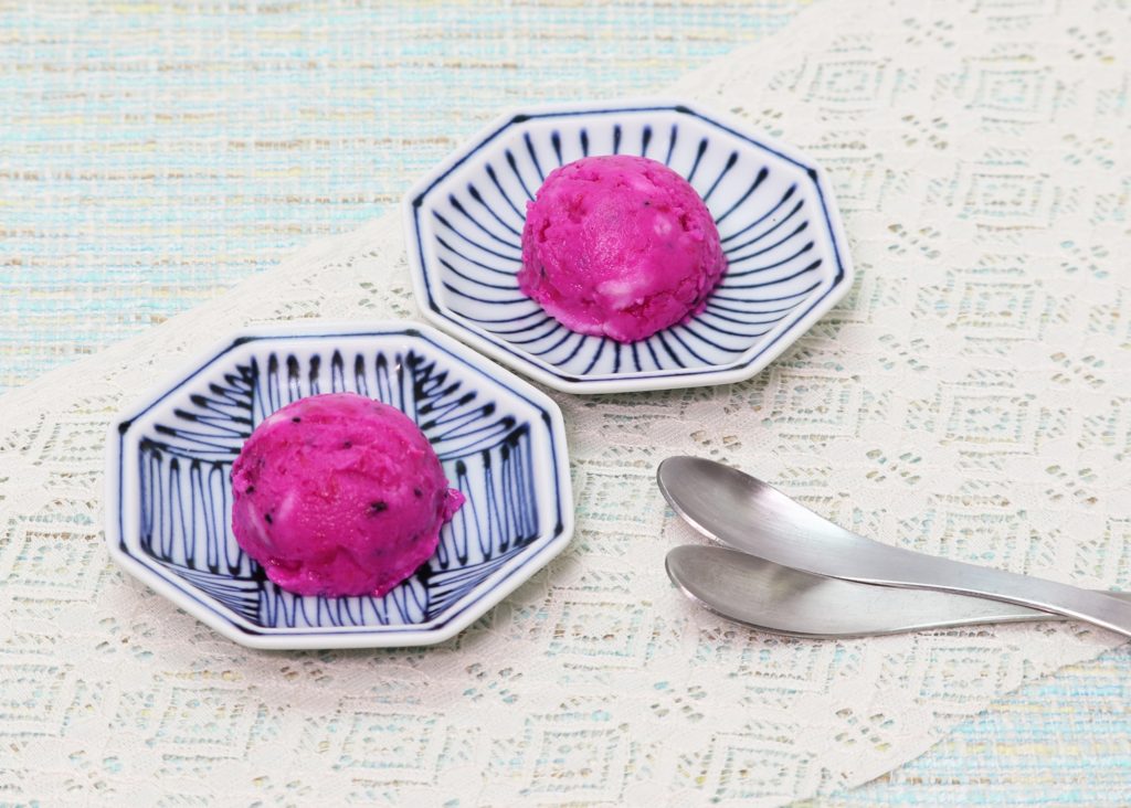 鮮やかな赤色と黒い種が特徴のドラゴンフルーツ。黒い種もそのまま食べられます。見た目は個性的ですが、スイカのようなクセのない味わいで、他の素材とも合わせやすいフルーツです。